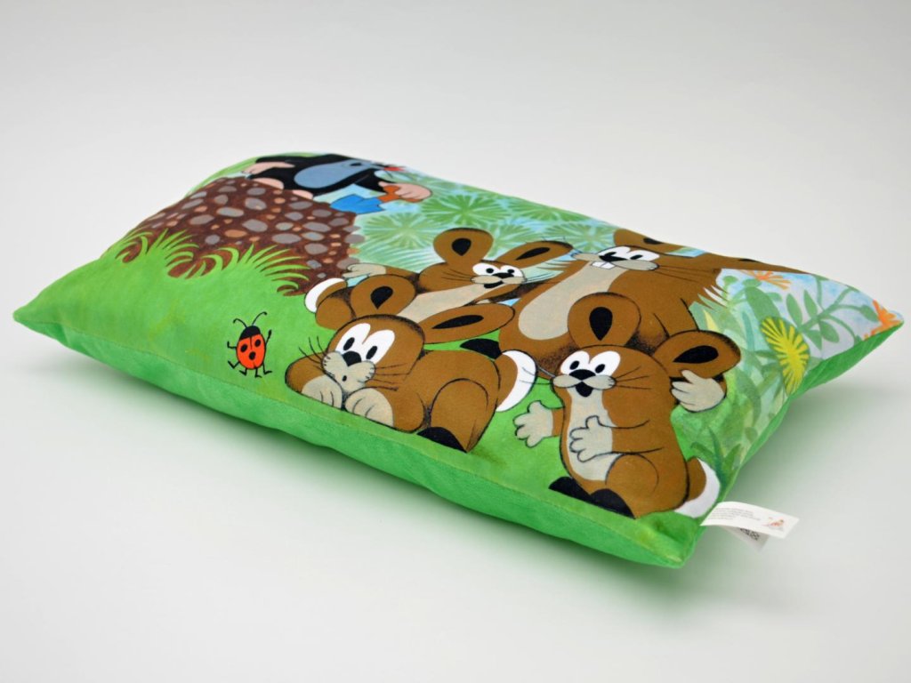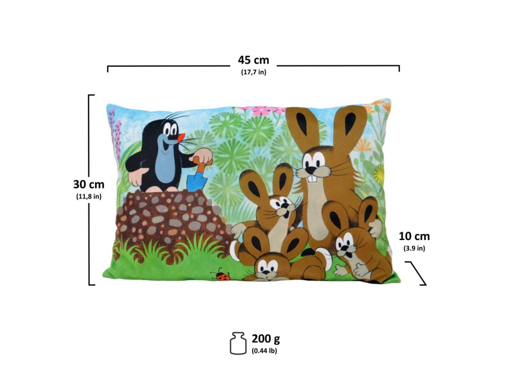 Tento detský vankúšik s motívom Krtka a zajačikov si zamilujú všetky deti. Jeho mäkký a príjemný materiál z mikrovelúru je šetrný k detskej pokožke, zatiaľ čo náplň z dutého vlákna zaručuje pohodlie pri spánku aj hraní. Obrázok Krtka je tlačený.